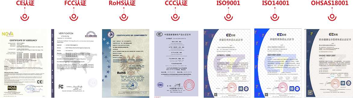 CE、FCC、RoHS、CCC、ISO9001、ISO14001、OHSAS18001認(rèn)證,并獲得質(zhì)量監(jiān)督局企業(yè)標(biāo)準(zhǔn)認(rèn)定。